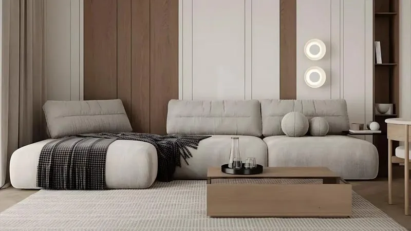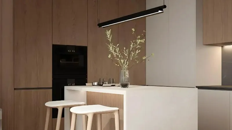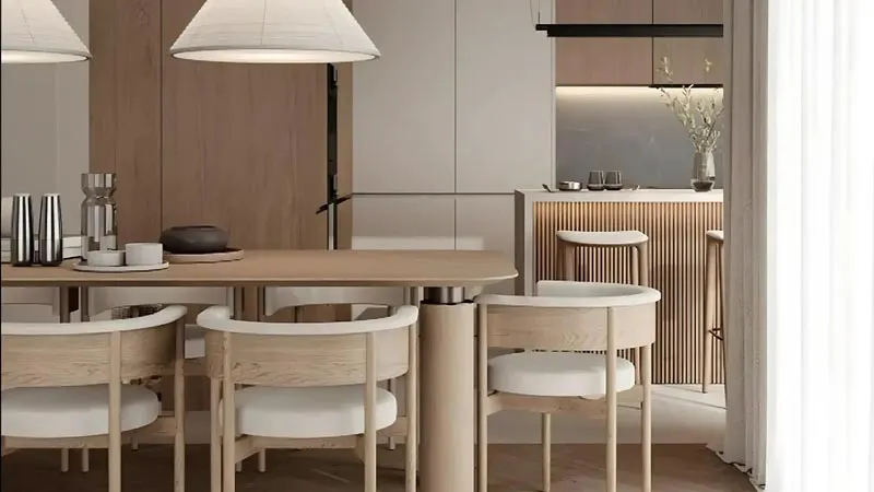 - Bright, open-plan interiors with neutral tones and warm wood detailing