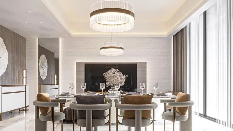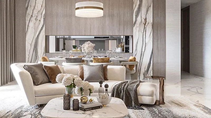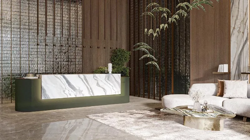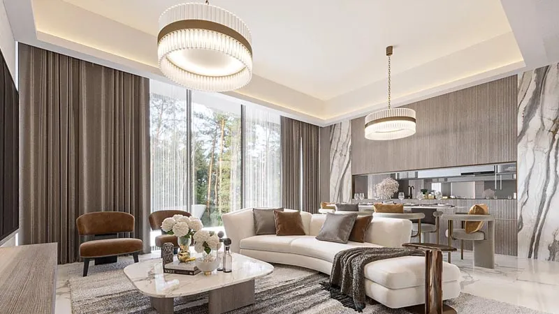 - Interior Features: Marble flooring, warm wood finishes, soft textures and flowing layouts