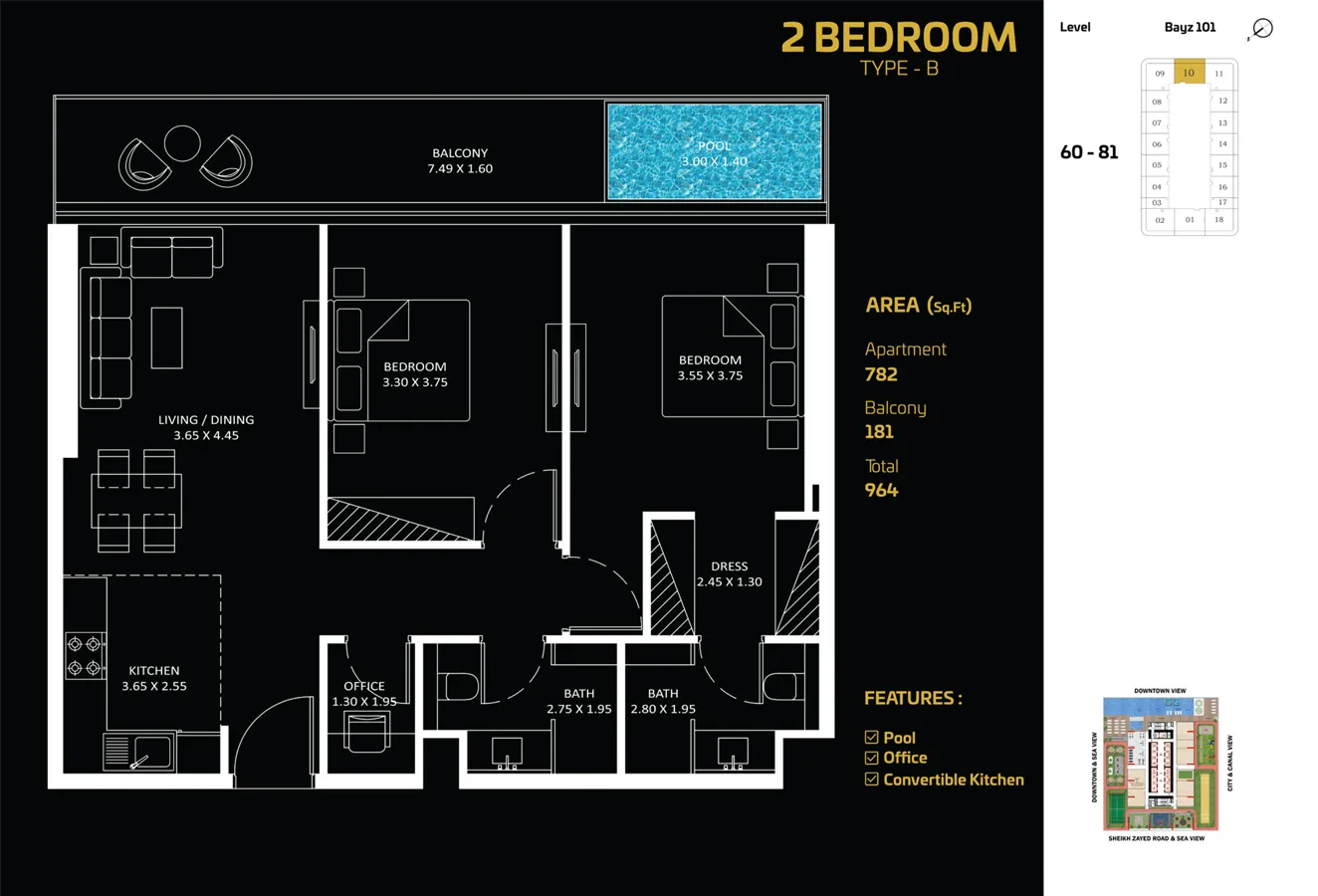 - Transit & access: walking distance to Business Bay Metro; close to Sheikh Zayed Road