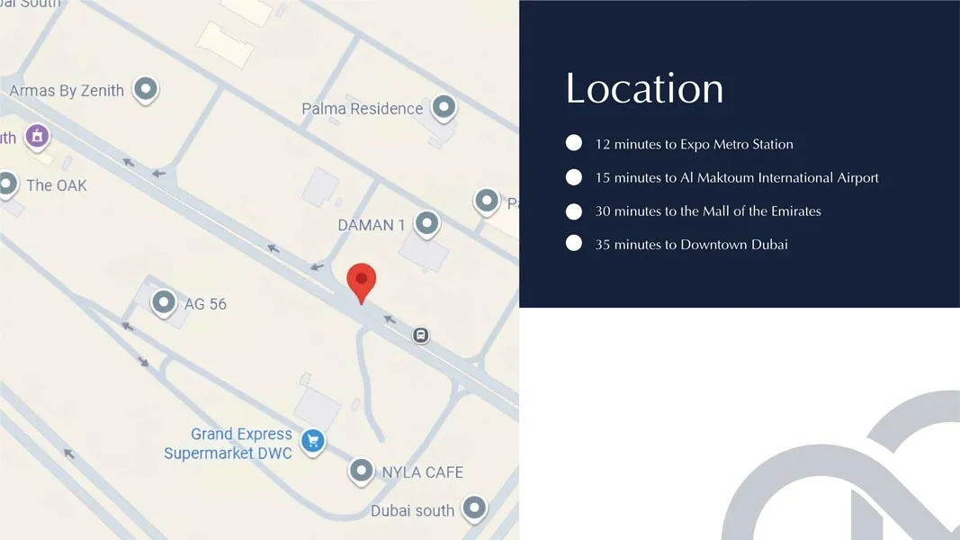 - Part of Dubai South master community (Residential City, Aviation District, Exhibition Zone)