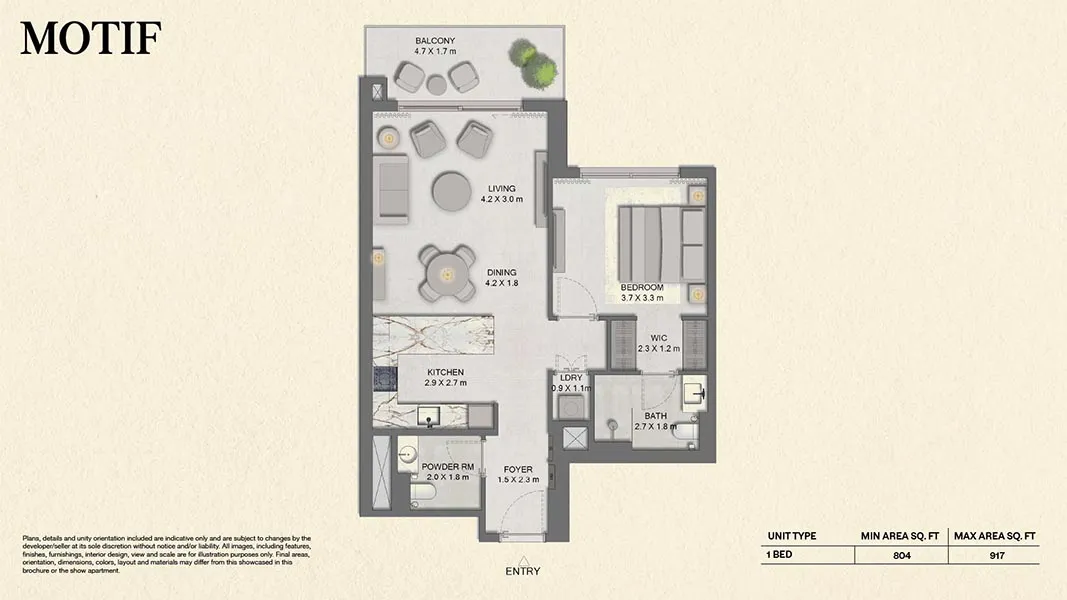 - 1BR: 804–1,068 sq ft
