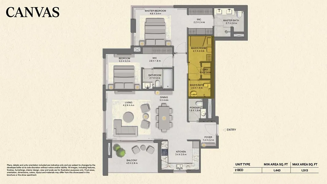 - 2 Bedroom + Maid Apartments: 1,443 – 2,194 sq ft