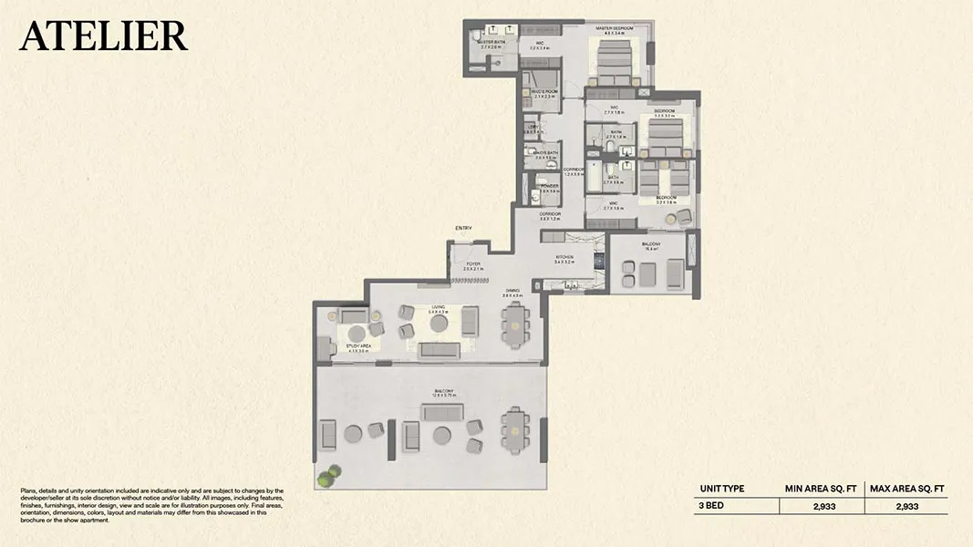 - 3 Bedroom + Maid Apartments: 2,933 sq ft (limited units)
