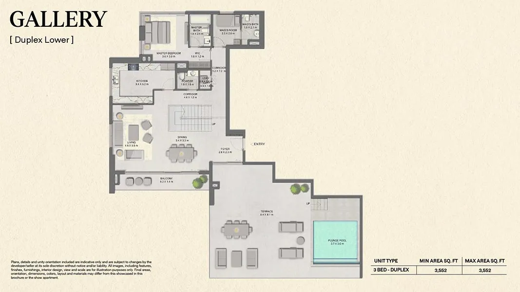 - 3 Bedroom Duplex + Maid + Pool: 3,552 sq ft (very limited units)