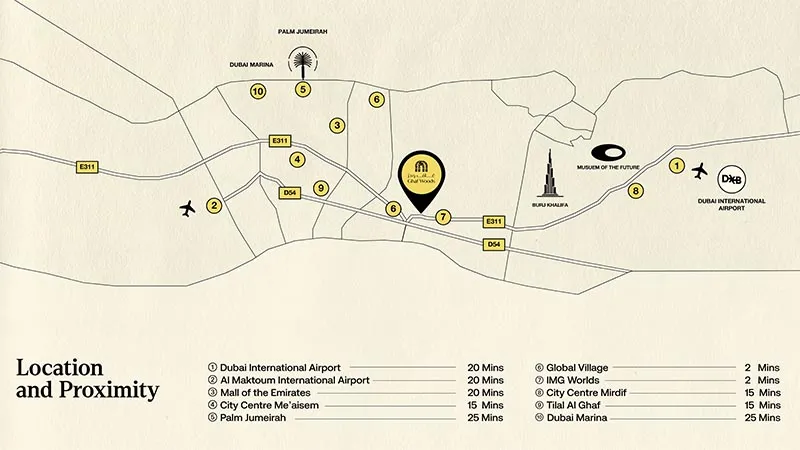 - Nearby Destinations: Dubai International Airport, Al Maktoum International Airport, Mall of the Emirates, Global Village, Dubai Marina