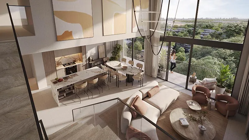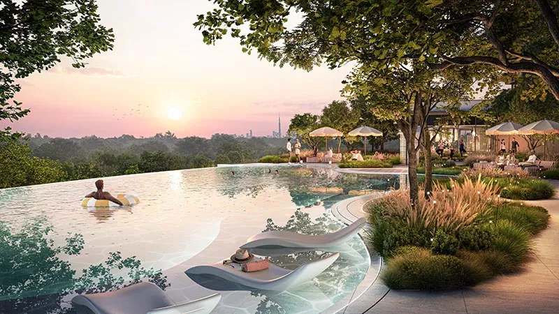The larger residences include spacious three-bedroom apartments sized at 2,933 sq ft and exclusive three-bedroom duplexes with maid’s rooms and private pools spanning 3,552 sq ft. These limited-availability units are designed for buyers seeking privacy, expansive layouts, and premium lifestyle features within a forest community in Dubai.