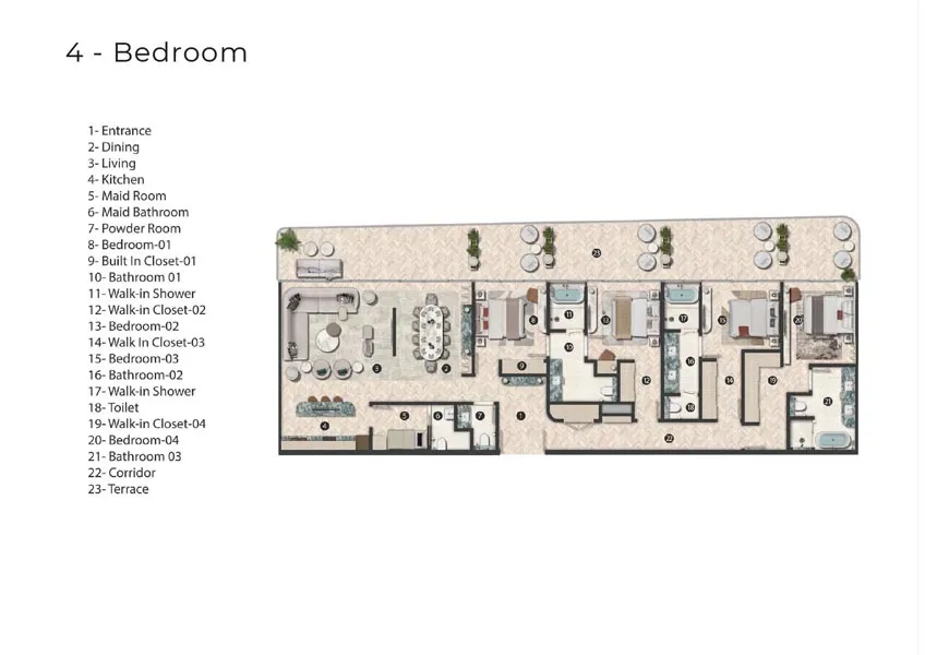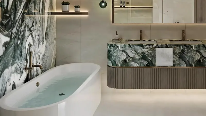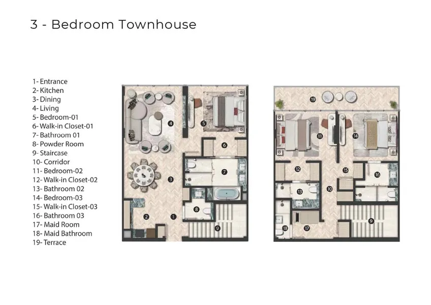 Interiors draw inspiration from Abu Dhabi’s natural contrasts, combining coastal waters with desert landscapes. The design palette features muted greens, desert neutrals, earthen browns, and subtle crimson accents, creating warm yet sophisticated living spaces. Open-plan living and kitchen layouts enhance natural light, spatial flow, and everyday functionality, making the residences suitable for both relaxed family living and refined entertaining.