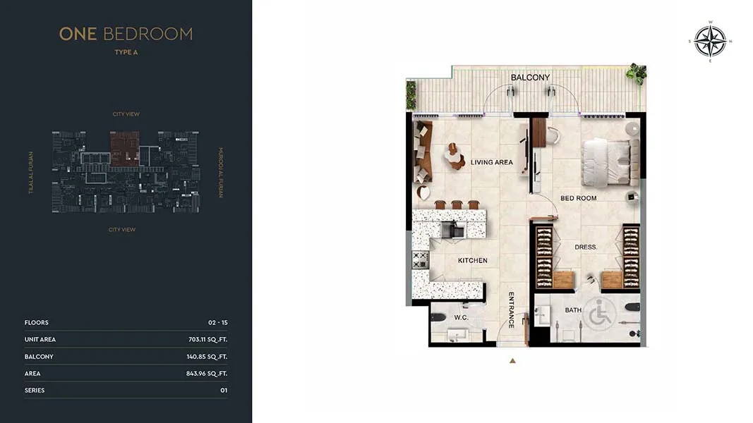 The residences at Kingdom Gate are thoughtfully planned across 1, 2, and 3-bedroom apartments, along with exclusive 3-bedroom penthouse and duplex-style homes. Unit sizes range from 823.87 sq ft for one-bedroom layouts to 2,371.93 sq ft for penthouses, featuring smart open plans, high ceilings, floor-to-ceiling windows, chef-ready kitchens, and spa-style bathrooms. Fully furnished interiors, neutral palettes, and curated lighting create warm, light-filled homes that balance elegance with practicality.