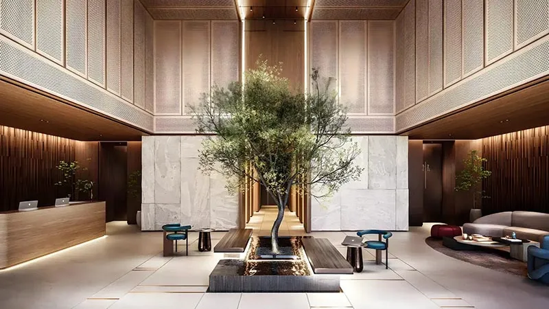 - Elegant lobby designed in a hotel-style layout with high ceilings and comfortable seating