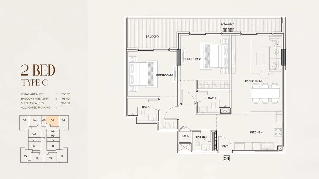 - 2-Bedroom: 1,028 – 1,158 sq. ft.
