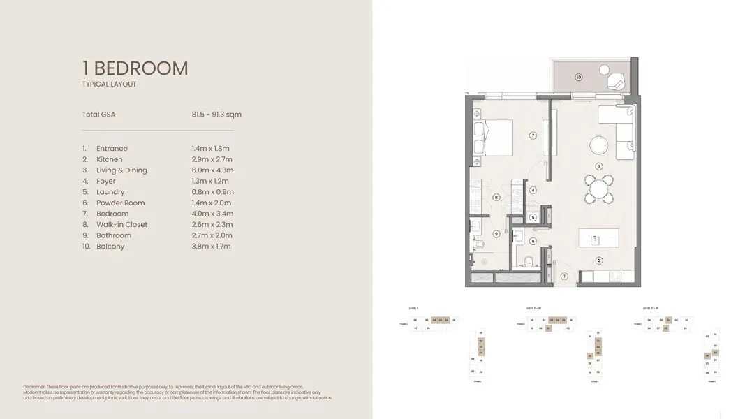 - 1 Bedroom Size: 81.5 - 91.3 Sq. M