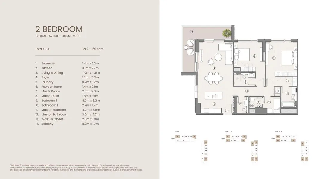 - 2 Bedroom Size: 121.2 - 169 Sq. M